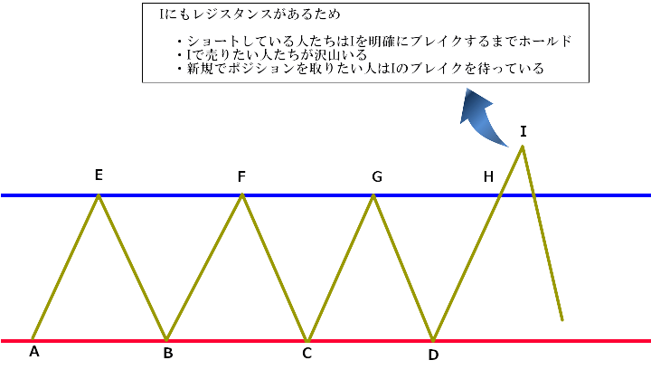 しかし、すぐ上にレジスタンスIという、売りが入ってきやすい水準があるため、レジスタンスIを超えるまでは売りポジションを保有継続しようという動機があります。 - 買い手ABCDは攻防に勝利して含み益が生じています。レジスタンスラインを突破した事実は、買いポジションを保有し続けることへの動機を与えます。Hで大口の買いが入ったことにより、売り手の損切りが誘発されれば、レジスタンスIも突破してくる可能性が高いですから、買いポジションの保有継続の動機があります。