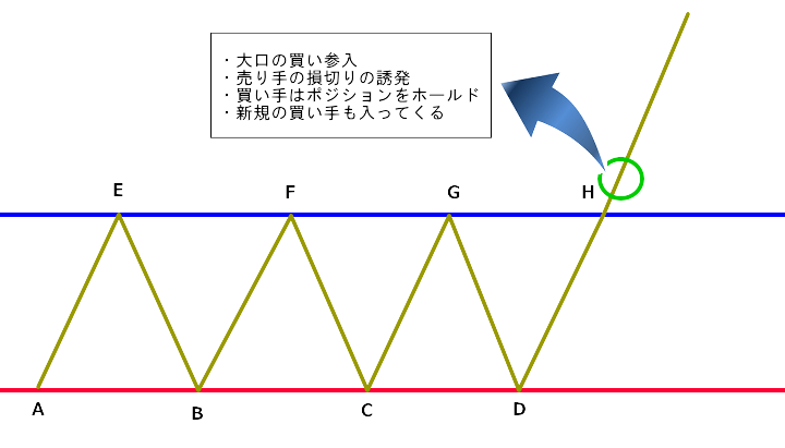 - 売り手EFGHは攻防に負け、レジスタンスを突破されたことで含み損が生じていますから、損失を最小限に抑えるために売りの損切り、すなわち買いを行います。
