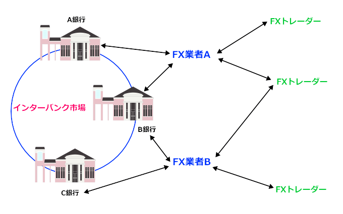 上の図では、FXトレーダーから注文を受けたFX業者が、提携先である銀行に更に注文を流していることを意味します。