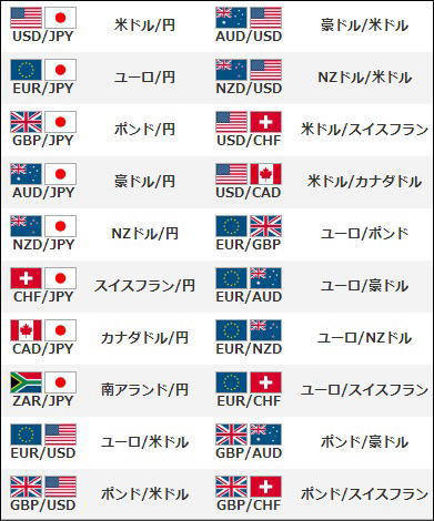 下の表は、日本のFX業者で多く取扱われている通貨ペアです。
