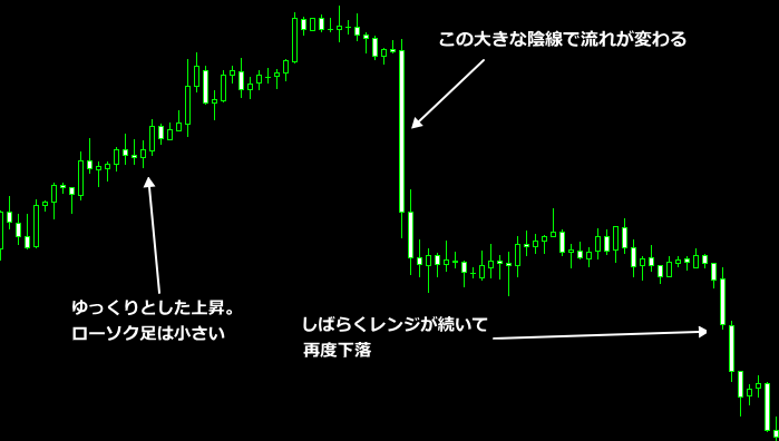 左側の上昇と右側の下落で勢いが違うように見えるのは、「ローソク足」の大きさが違うからです。ローソク足が大きいほど相場の勢いがありますし、相場の転換点になることもあります。