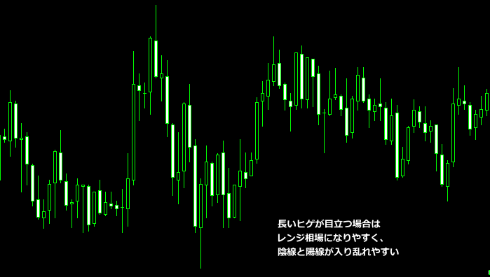 まず簡単に言えば、長いヒゲが多く目立つチャートは、売りと買いが拮抗しており相場の勢いが乏しい状態であると言えます。