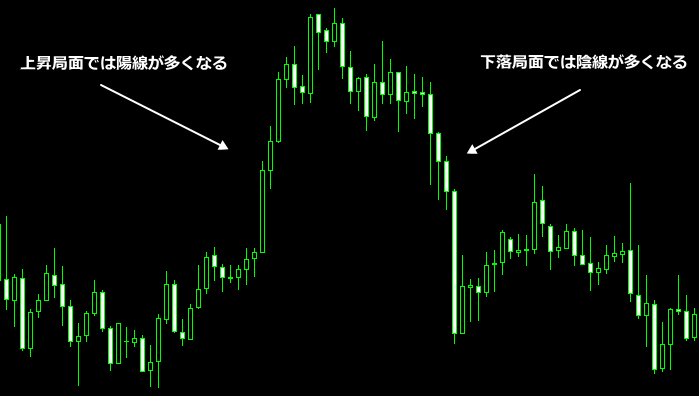 上昇相場では陽線が多く出現し、下降相場では陰線が多く出現する