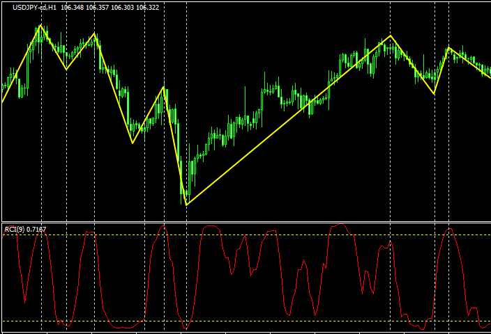 RCIが下限に達したら、次に上限に達する前までの間で、最も低いレートを付けたローソク足に縦線を引きます。