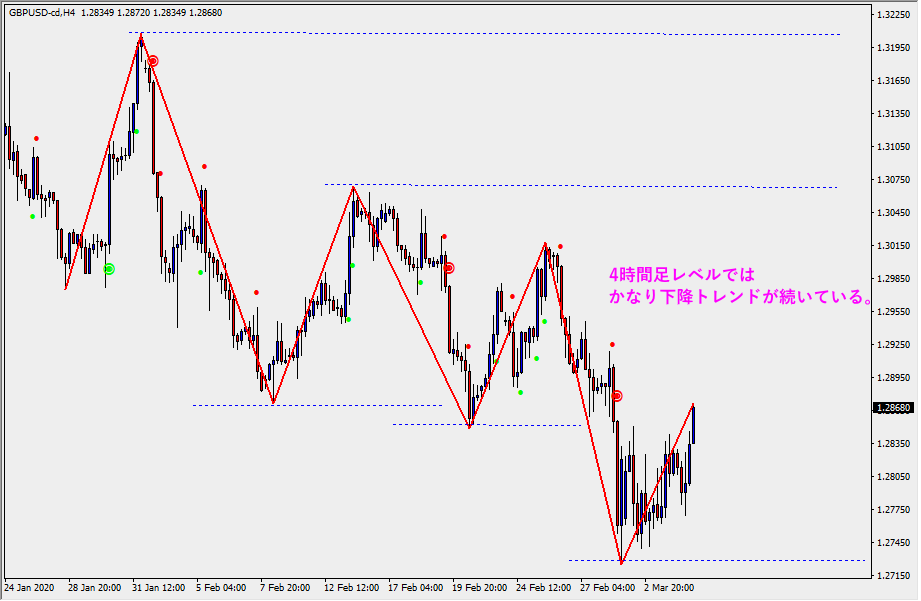 - 4時間足:下降トレンド中