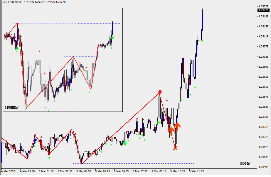 この時点で1時間足の直近の高値を抜けています。