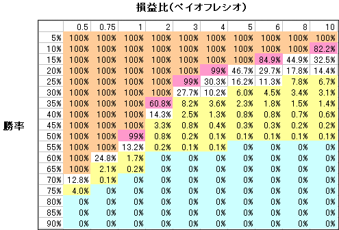 を用いて算出されるもので、この条件で取引を際限なく繰り返すとき、運悪く破産する確率はどれくらいあるのか?を求めるものです。