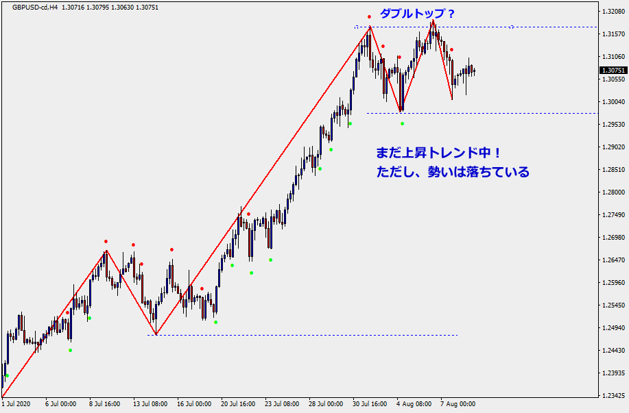 だが、直近の動きを見るとダブルトップを形成しており、やはり勢いが落ちている。