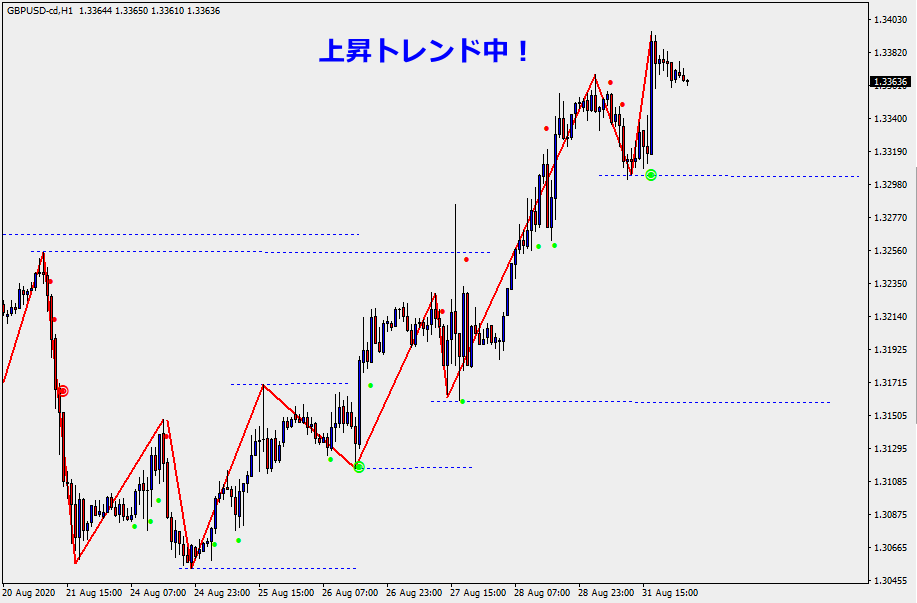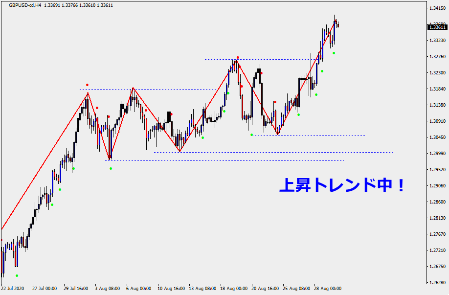- 4時間足:上昇トレンド中。上げに弾みがついている。