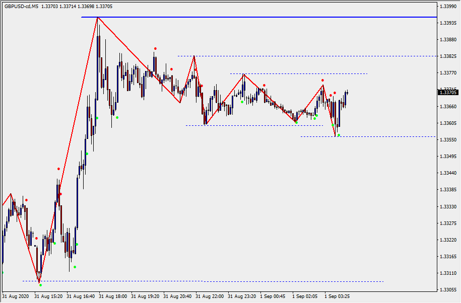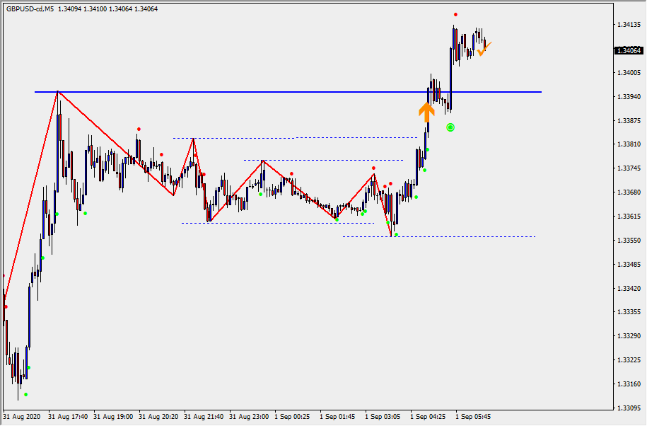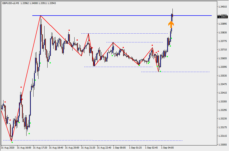 地味に下げていた5分足が、急に上げ始めて、前日の高値をブレイクしました。