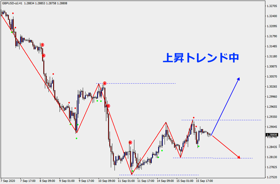 • 1時間足:上昇トレンド中。上げそうな流れではある。