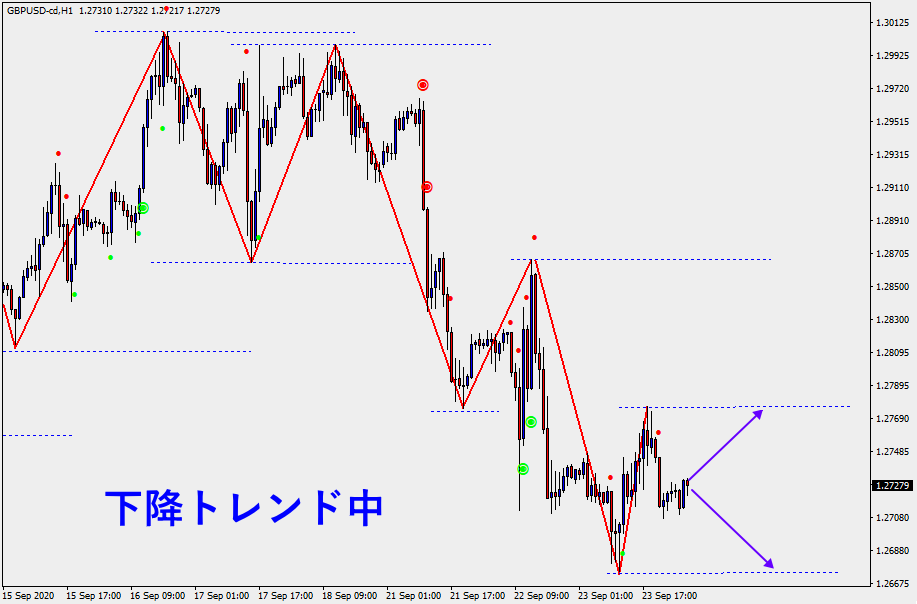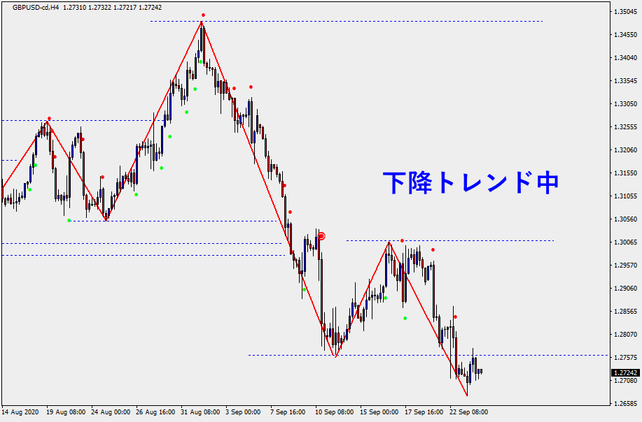 4時間足と1時間足で明確な下降トレンド中になっています。