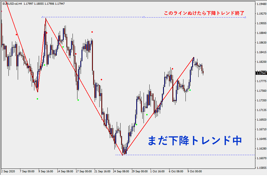 - 4時間足:下降トレンド中。ちょっと売りが入りそうな状況