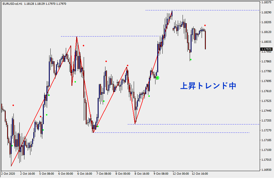 - 1時間足:上昇トレンド中。だが上が重く下げて来ている。
