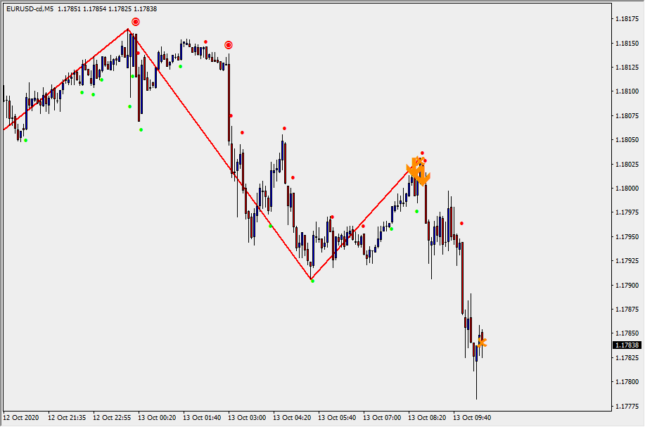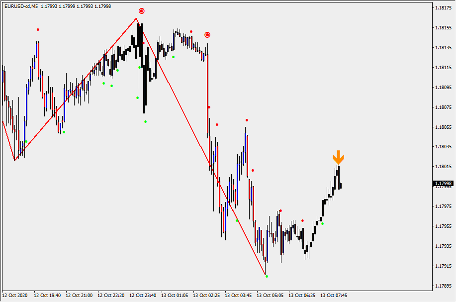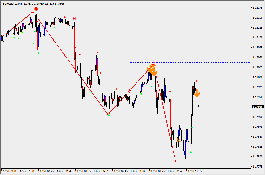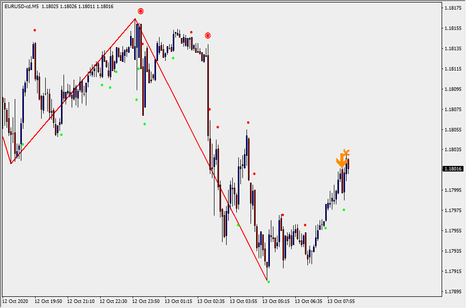 直近安値をブレイクして、ドットの付いた足も確定したのでショートエントリーです。