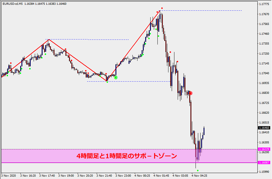 しばらくすると、もっと下げて4時間足と1時間足のサポートライン間のサポートゾーンまで割り込んできました。