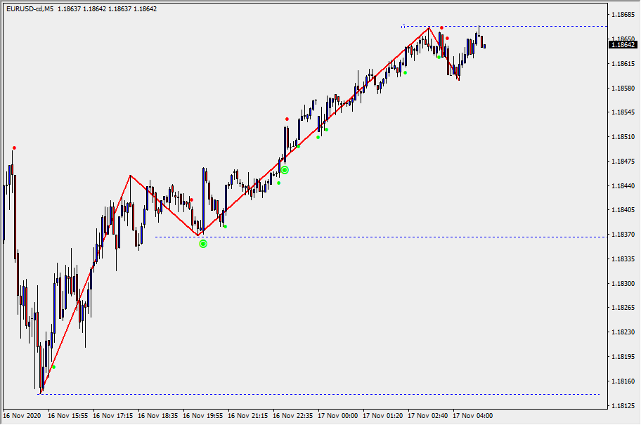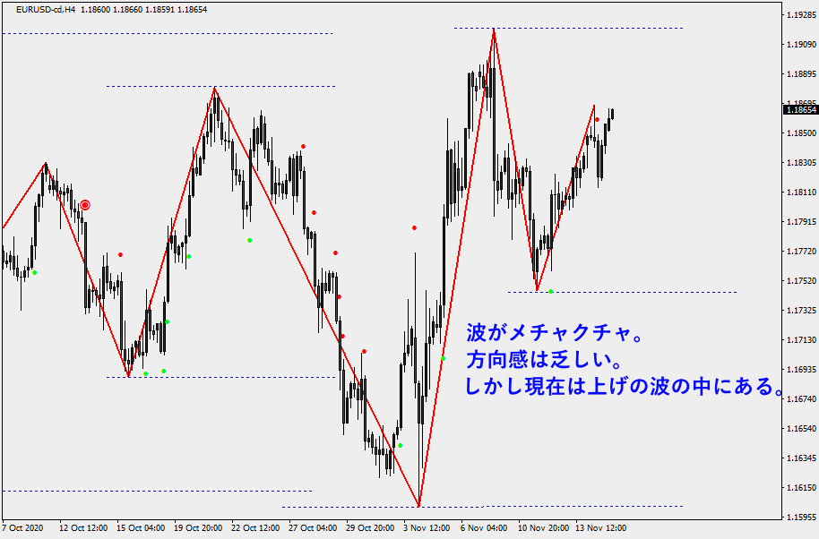 拡大したり、縮小したりと分かりにくいが、現在は上げの波の中にはある。