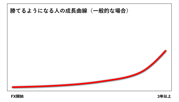 もちろん天才的な人ならもっと早い段階で勝てるようになるかもしれませんが、私を含めた一般的なトレーダーであれば、しっかりと努力しないと上のような成長曲線にはなりません。