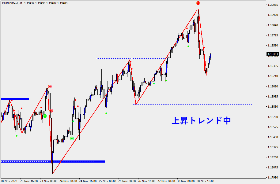 - 1時間足:1.2000から下げたが、上昇トレンドをキープ。反発中
