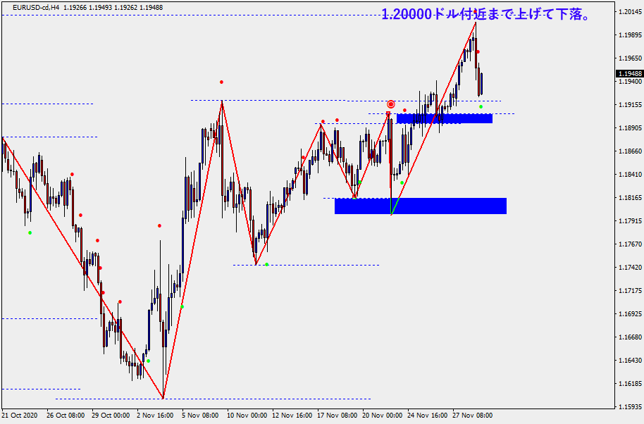 - 4時間足:上げの流れだが、1.2000付近まで来てからは大きな陰線が続く