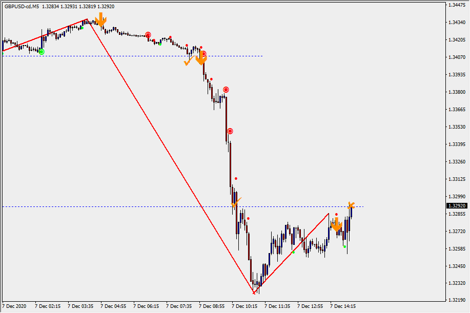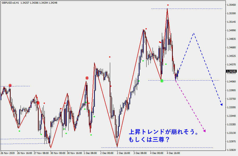 - 1時間足:上昇トレンドが崩れかけ。反発して三尊になるか、それともこのまま下げるか。