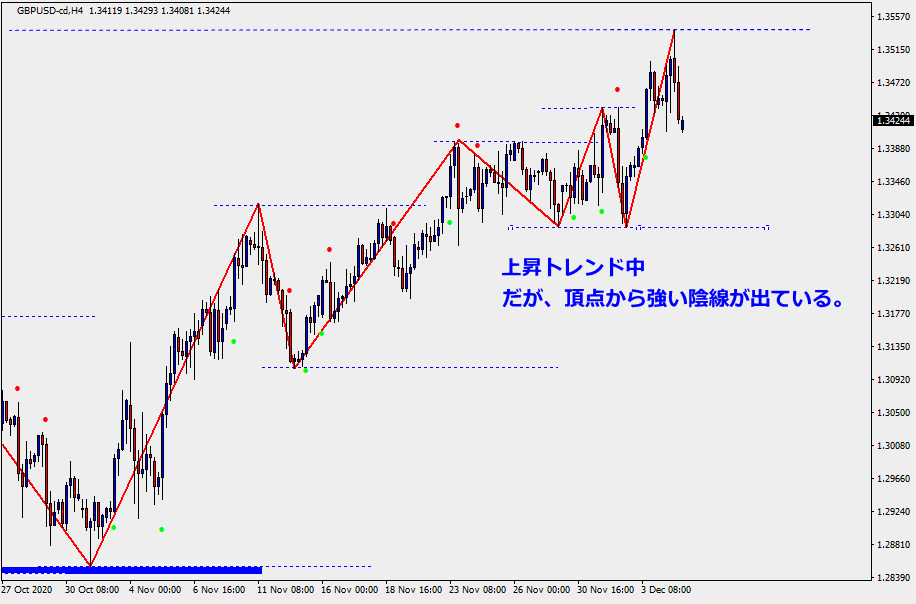 - 4時間足:上昇トレンド中だが、強い陰線が連続している