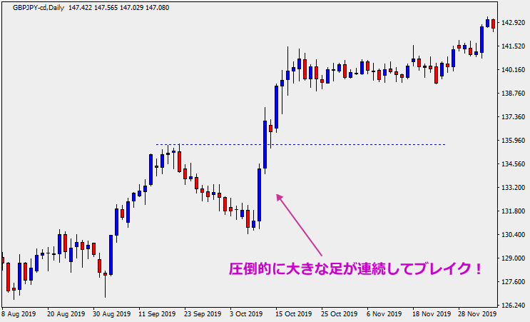 ブレイクが成功しやすい典型的な例は、ブレイク前から明らかに大きな足が連続します。