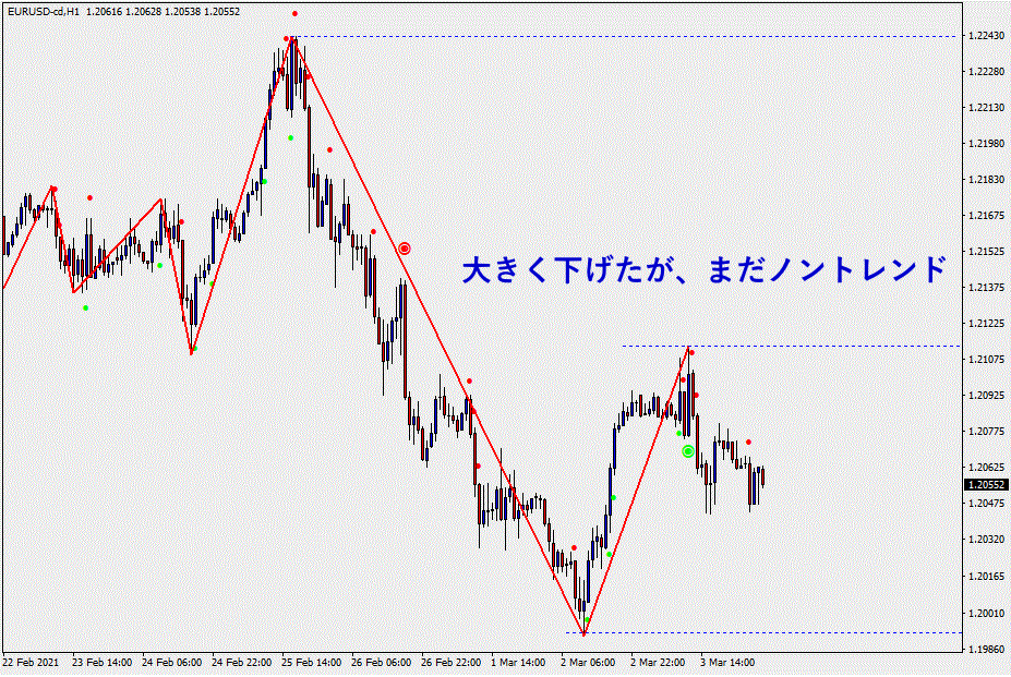 直近の下げの波で勢いよく下げたが、まだノントレンド。