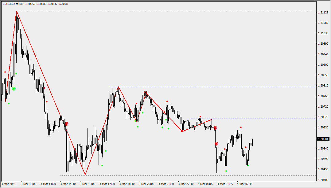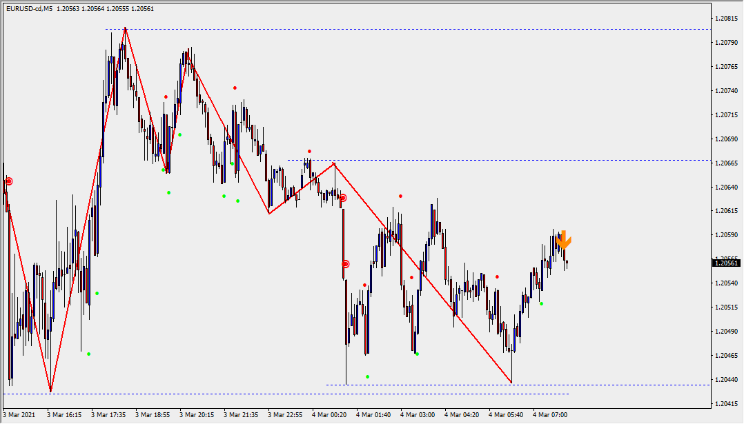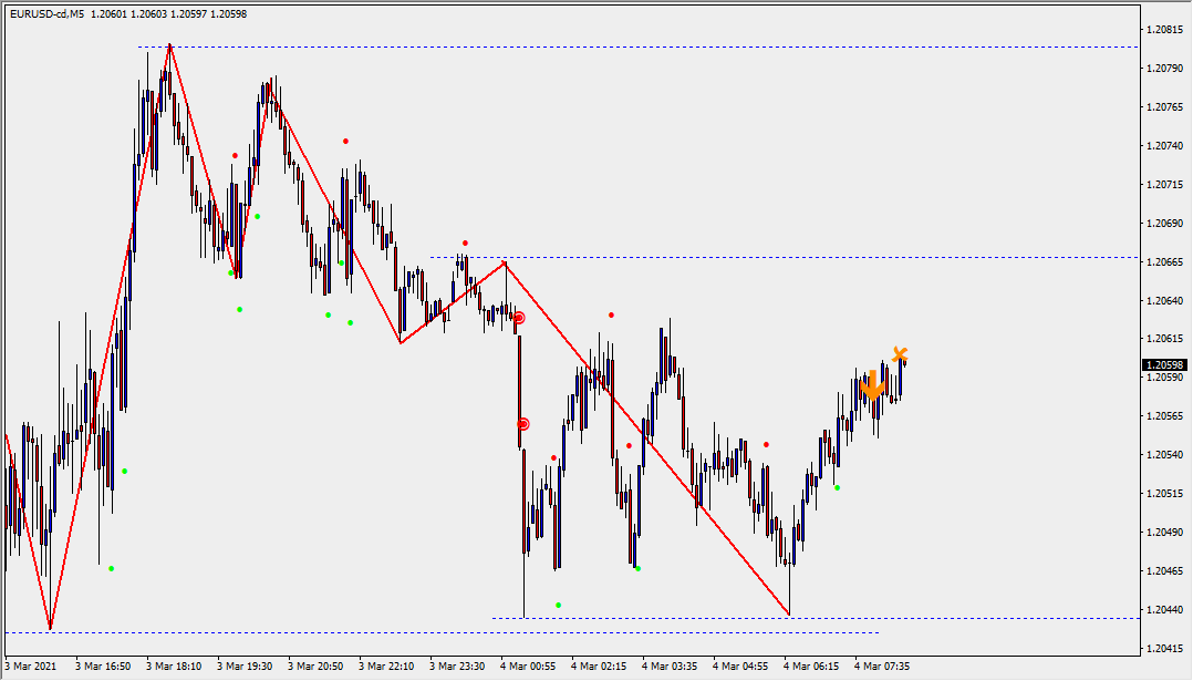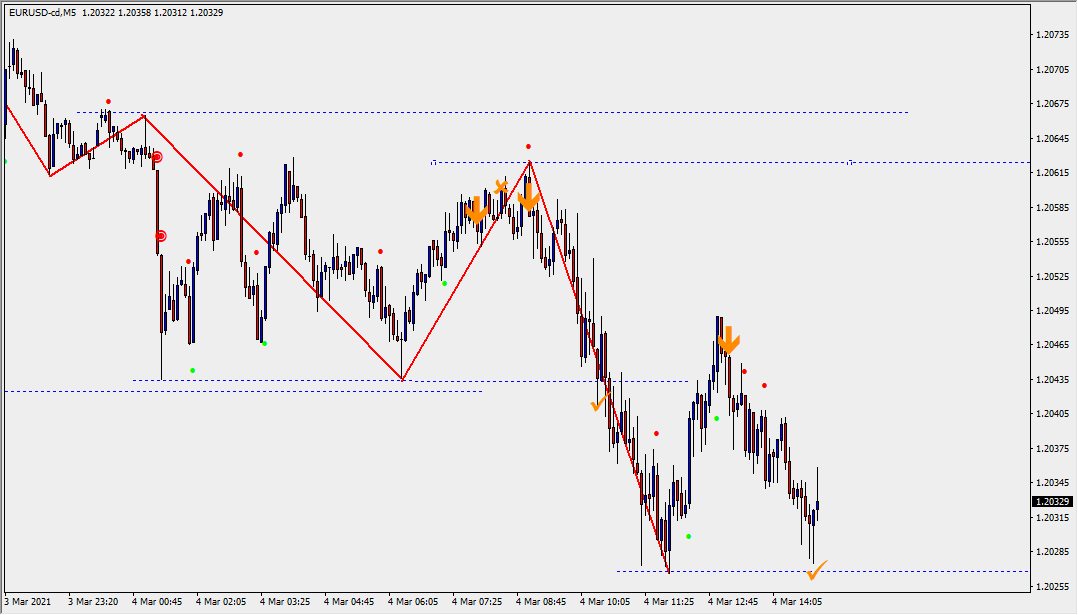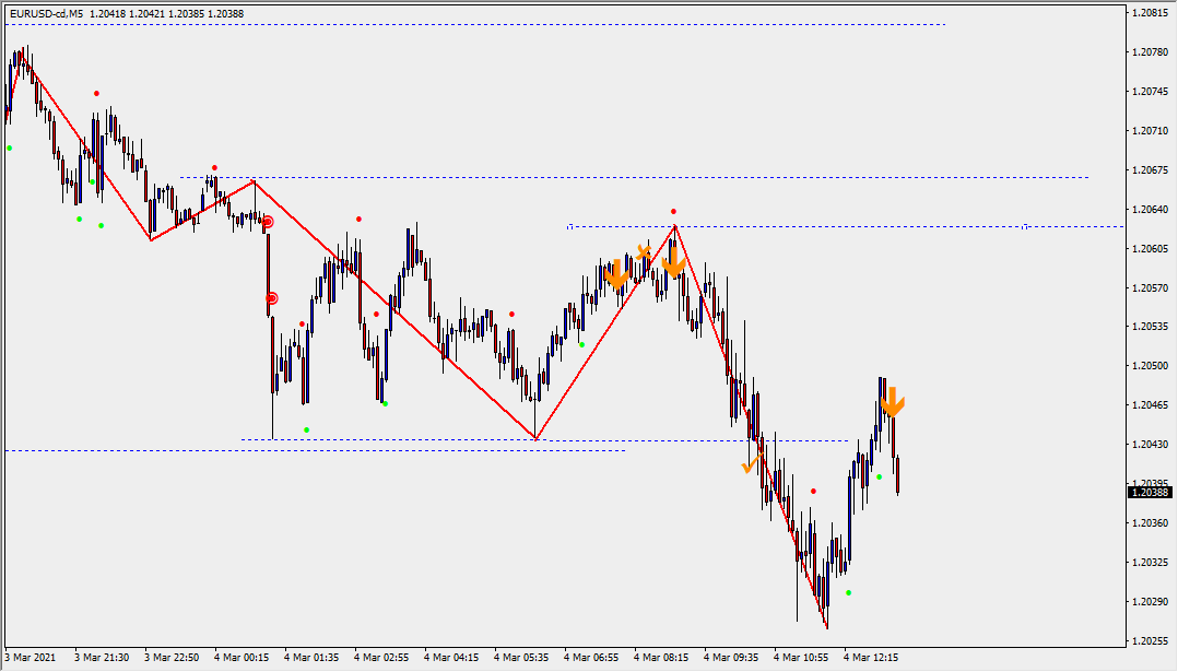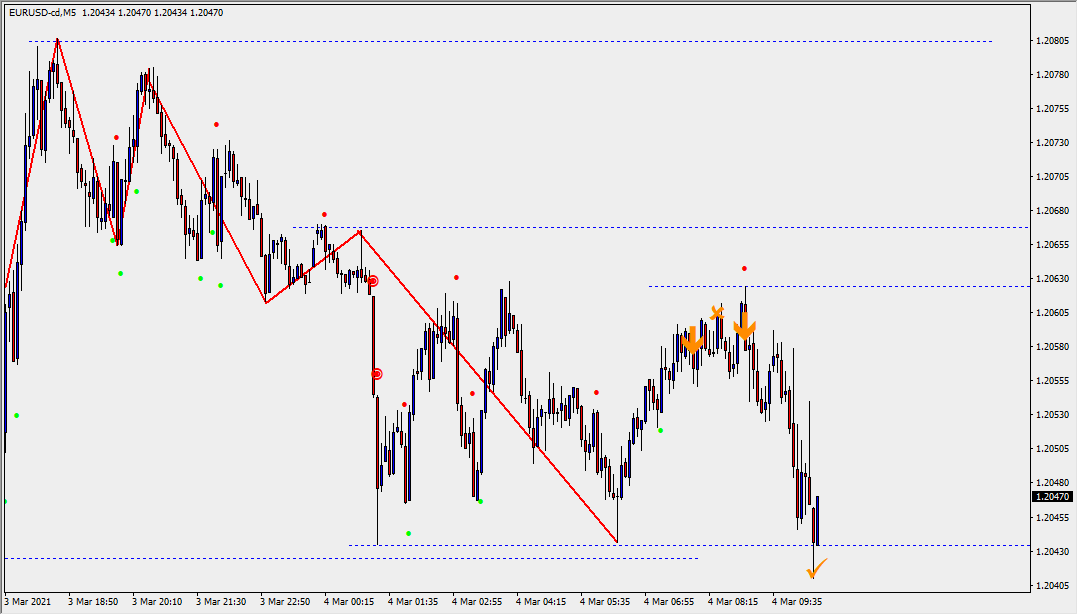 - 1時間足:ノントレンド、大きく下げて戻りして再下降中