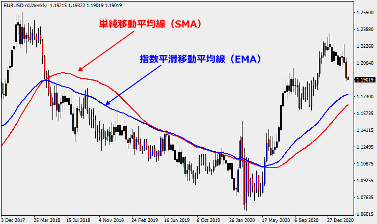 単純移動平均線は全期間を等しく平均してしまうのに対して、EMAは直近の価格を重視する計算式になっています。