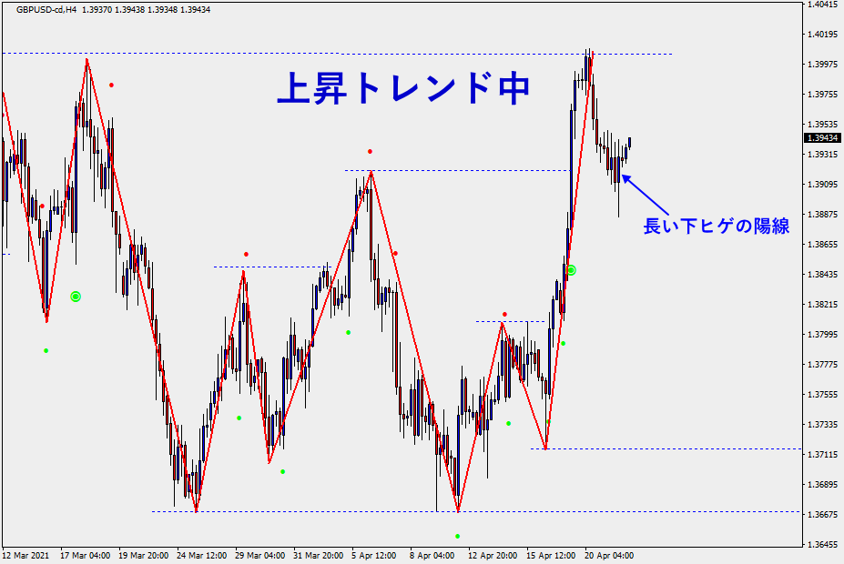 - 4時間足:上昇トレンド中。押し目を作って反発している