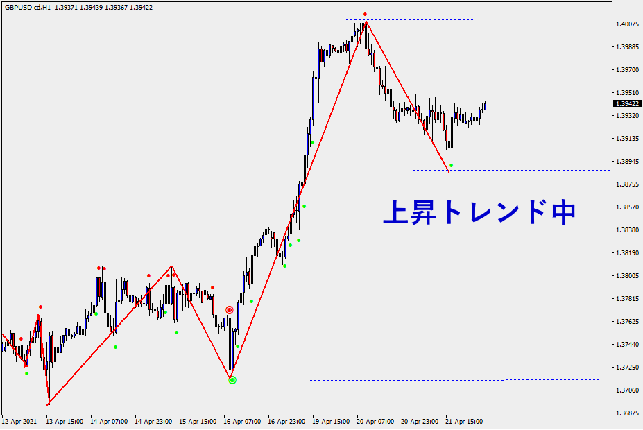 - 1時間足:上昇トレンド中。これからレンジをブレイクしそうな感じ