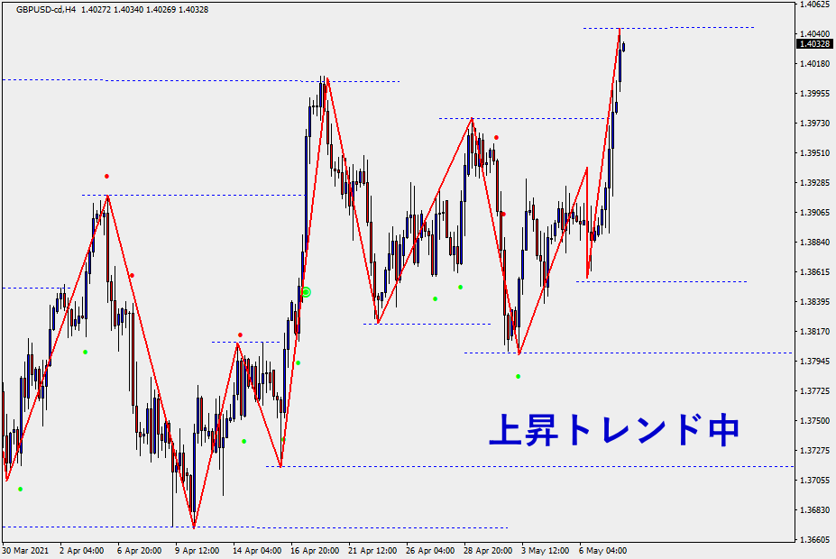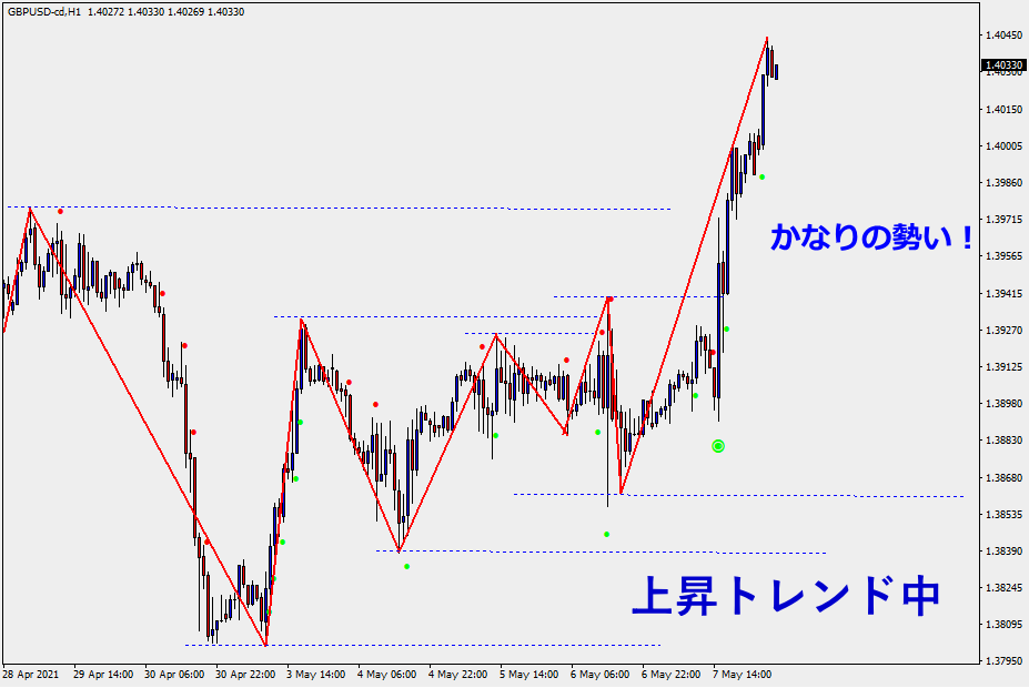 - 4時間足:上昇トレンド中。上げに弾みがついている。