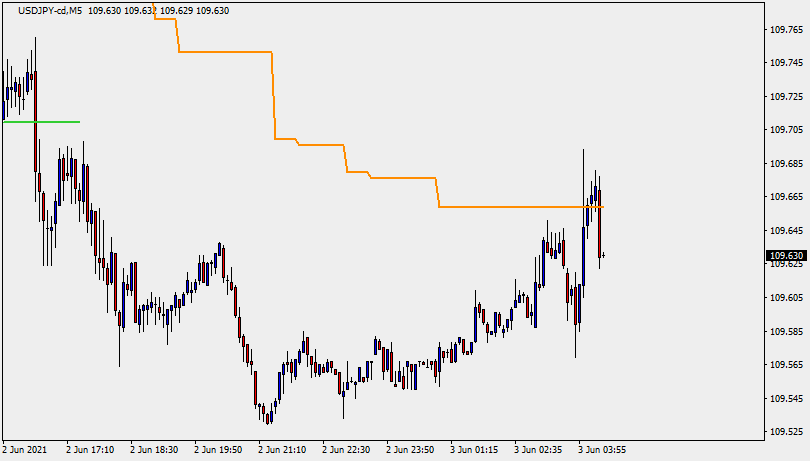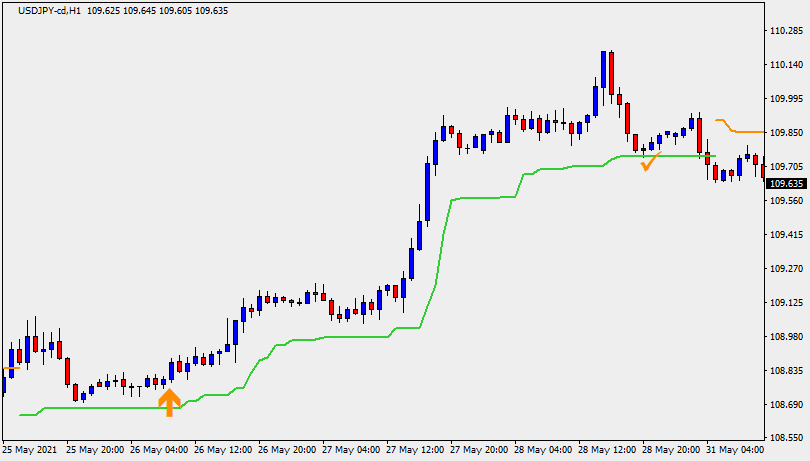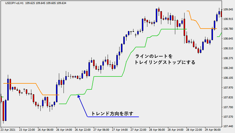 ローソク足の下にラインがあれば上昇トレンド中、ローソク足の上にラインがあれば下降トレンド中で、ラインのレート自体がトレーリングストップや損切りの参考値となります。
