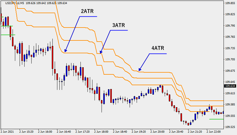 値を大きくするほどATRストップがローソク足から離れるため、深めの損切りやトレーリングストップになります。