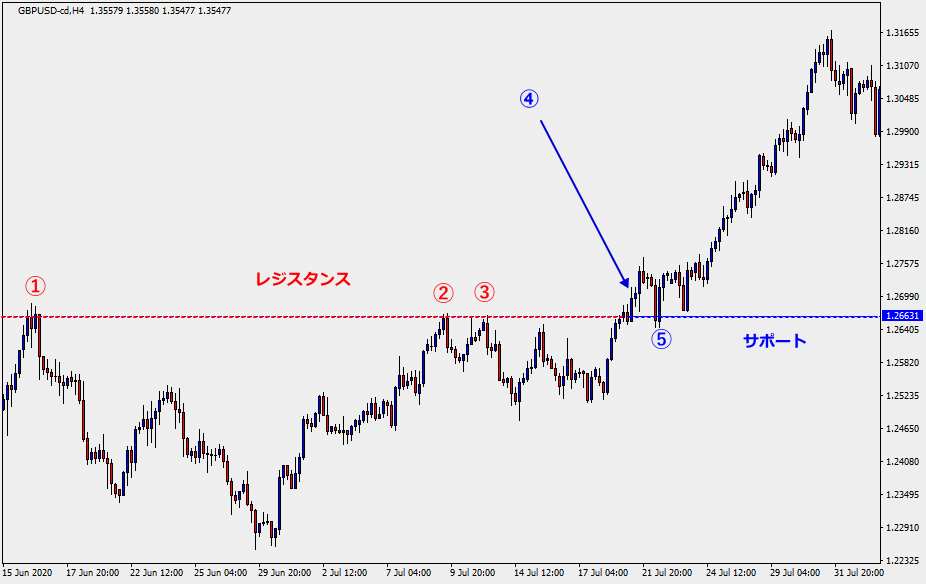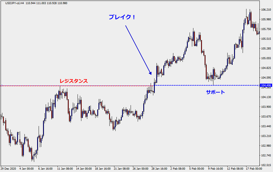 - レジスタンスラインがブレイクされたら、今度はサポートラインとして機能する