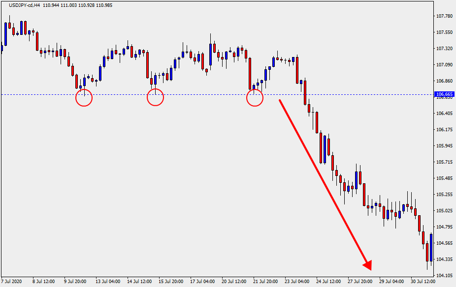 サポレジラインの全てがブレイク後にロールリバーサルするわけではありませんが、ブレイク前にしっかりと機能していたラインほどロールリバーサルする可能性は高まります。