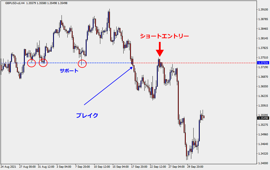 その後ある程度下げてから以前のサポートラインに戻ってきたところでショートします。以前のサポートがロールリバーサルによってレジスタンスになっていると考えるわけですね。