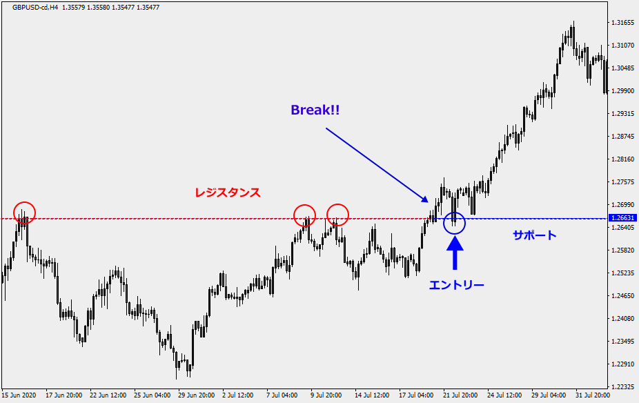 - ブレイク後、少し進んでからサポレジラインまで戻るのを待つ