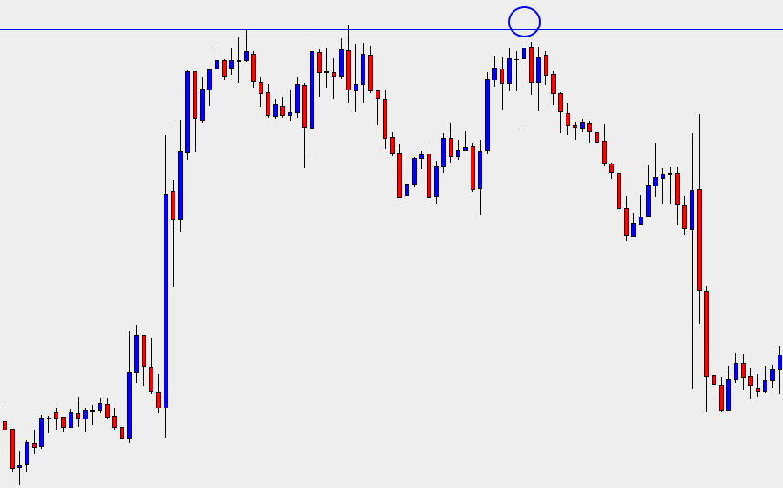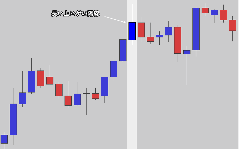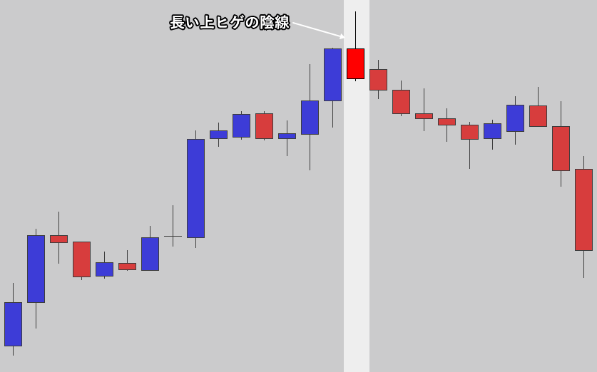 例えば上のチャートでは、最高値を更新した足が、長い上ひげを伴う陰線となっています。