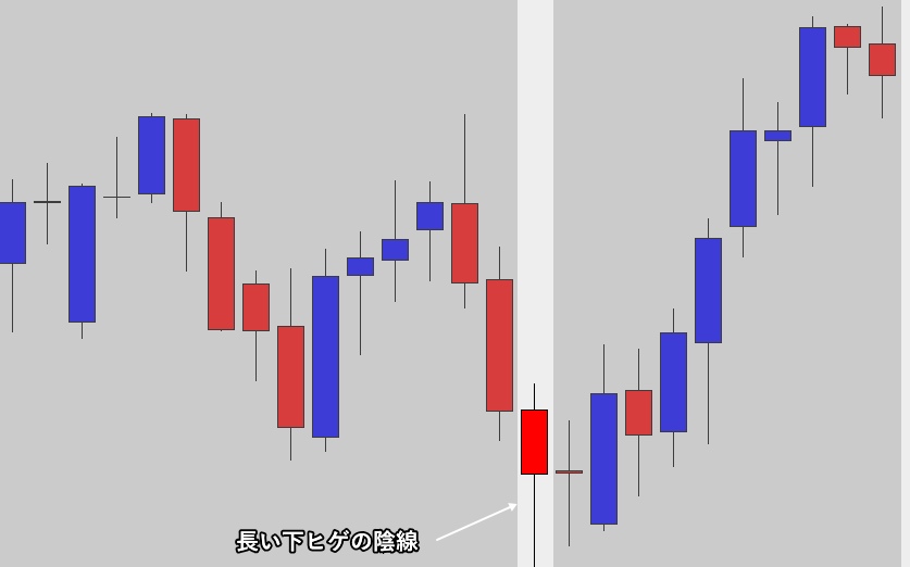 上のチャートのように特に下ヒゲ長い陽線は明確な意思を持った上昇シグナルになります。これは上ヒゲの長い陰線と同じような考えです。