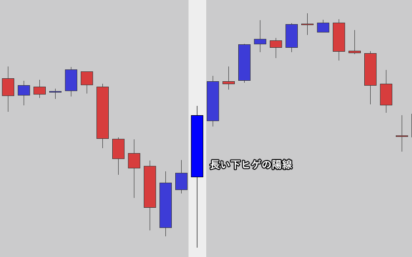なぜなら、一度下落後に全戻しして更に上昇した結果、下ヒゲのある陽線となるからです。