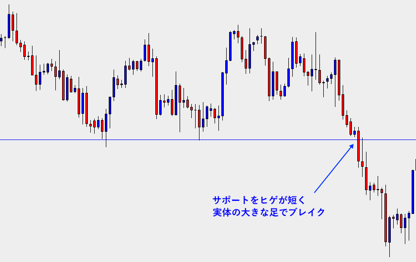 前項で、「ラインタッチした足のヒゲが長ければエントリー」と解説しましたが、ラインをブレイクする足はどのようになっているのでしょうか?