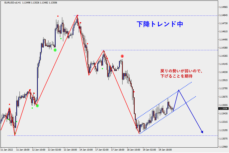 • 1時間足:下降トレンド中。戻りが弱く、更に下げそう。