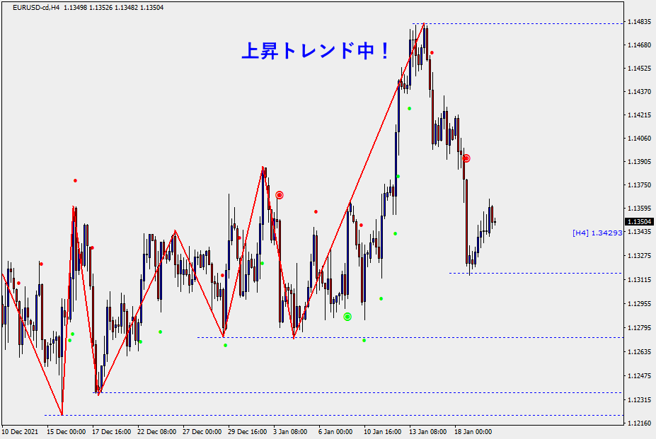 • 4時間足:上昇トレンド中。強めの押しが入っている