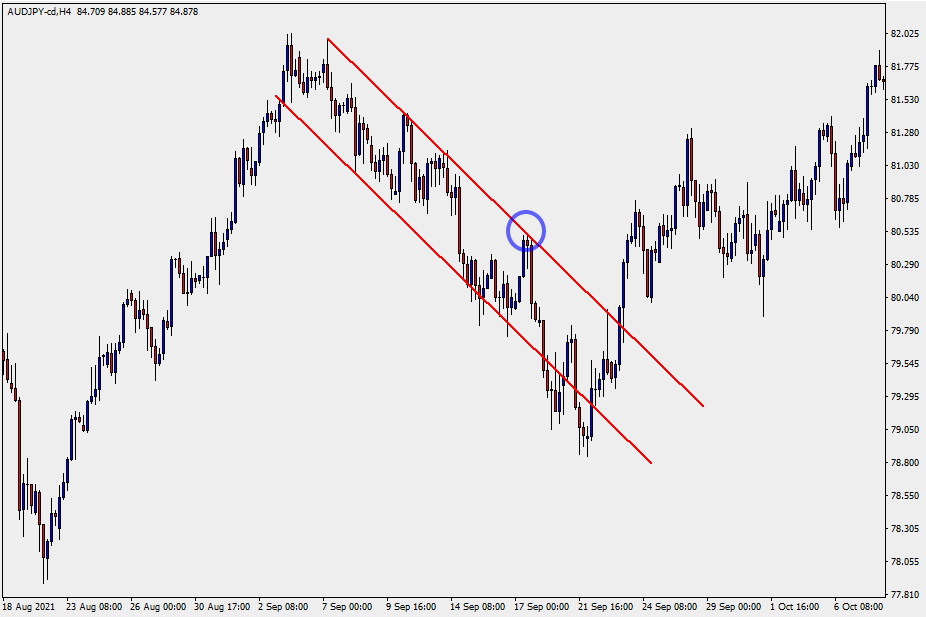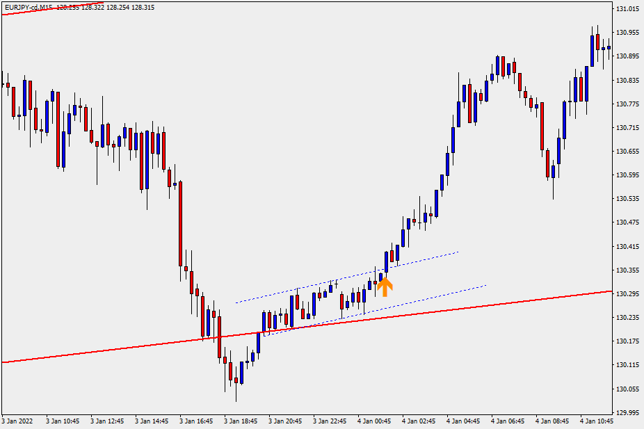 トレンドの勢いが加速するとアウトラインをブレイクすることはよくありますので、チャネルラインはあくまでもトレンドフォロー用のツールと考えましょう。