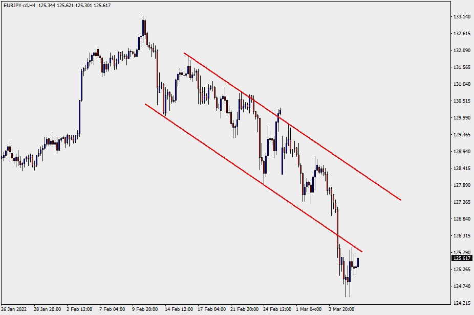 トレンドラインを引くだけでもトレンド方向が分かりやすくなるのですが、チャネルラインを引くことで、より視覚的にトレンド方向が分かりやすくなります。