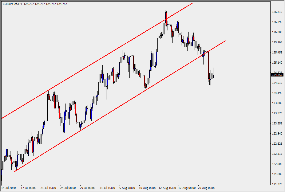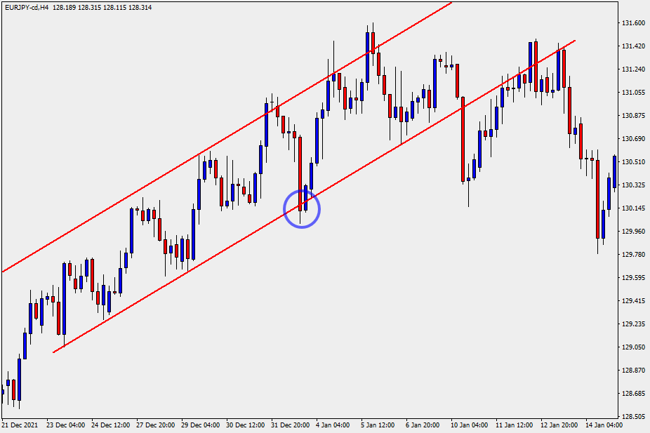 しかし、必ずしもそうなるわけではなく、ブレイク後にすぐに反発して新たなチャネルラインを描くことも良くあります。