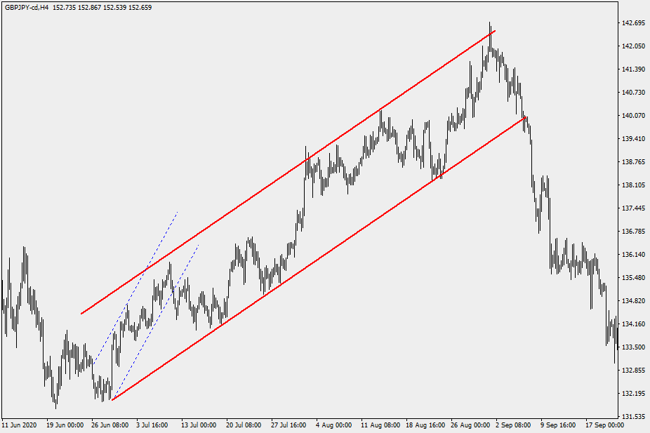 場合によっては急角度のチャネルラインがブレイクされた後、他のサポートで反転し緩やかな角度のチャネルラインを形成することもあります。