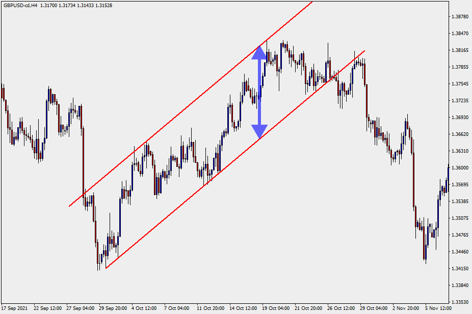 チャネルラインの理論としては、ブレイクしたらチャネルラインの値幅分だけ逆行するとされています。